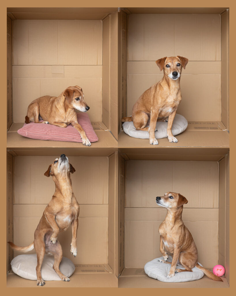 Photo In the Box pour petit chien (pour qu’ils soient à l’aise dans la boite) : 45€pour 5 photos (les 4 photos + le montage)